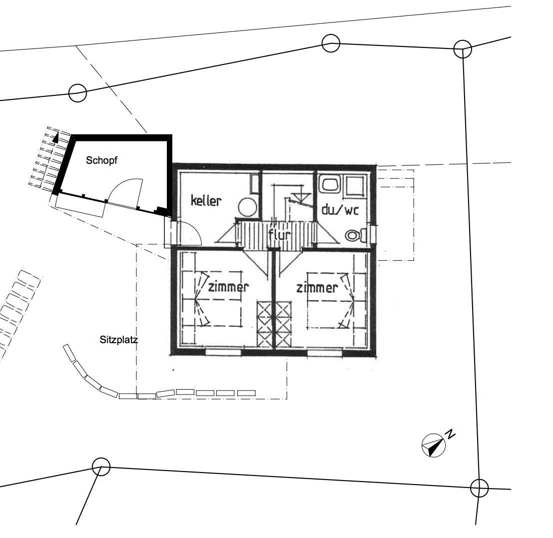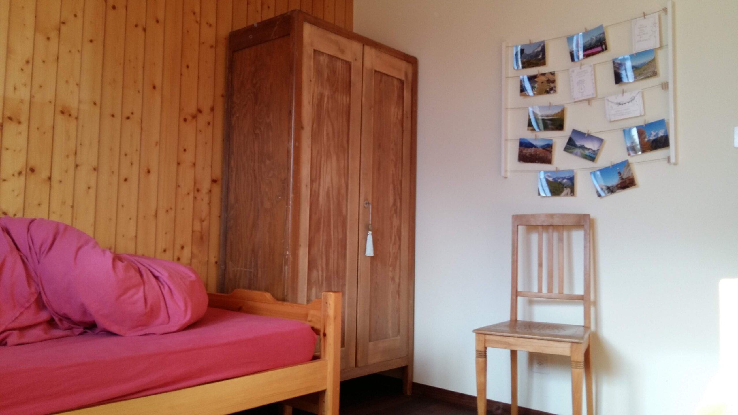 Untergeschoss: Schopf für Ski und Schlitten, Eingang, Garderobe, Dusche mit WC, 2 Schlafzimmer (ein Zimmer mit Doppelbett, ein Zimmer mit zwei Einzelbetten, eine aufblasbare Matte sowie Bettgitter für Kinder unter dem Bett)