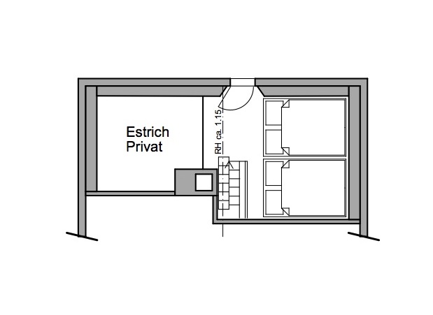 Dachgeschoss: 2 Matzratzen à 1.40m (4 Schlafplätze), plus privater Estrichbereich
